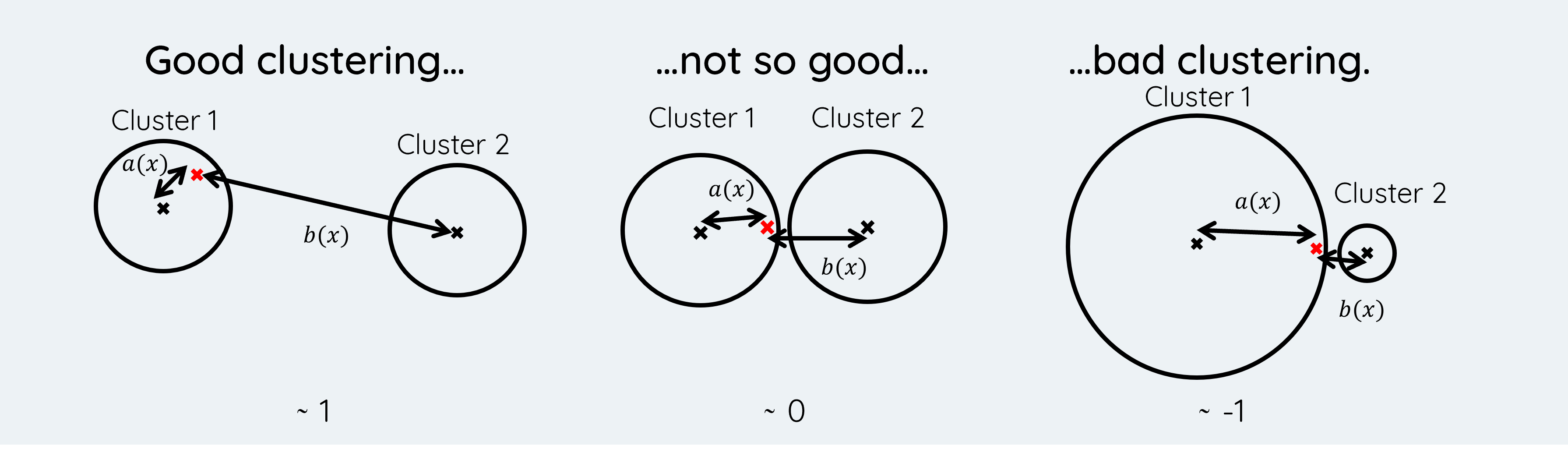 | Schlechtes Clustering | Punkt ist näher an fremdem Cluster als am eigenen | ≈ -1 |