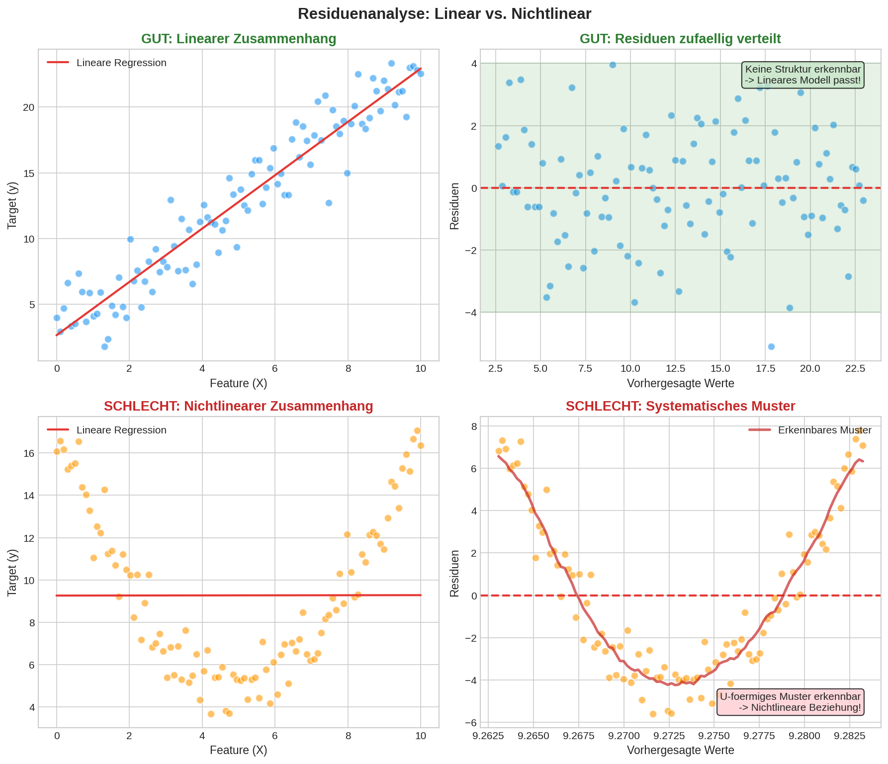 | Residuen ignorieren | Modellprobleme übersehen | Immer Residual Plot erstellen |