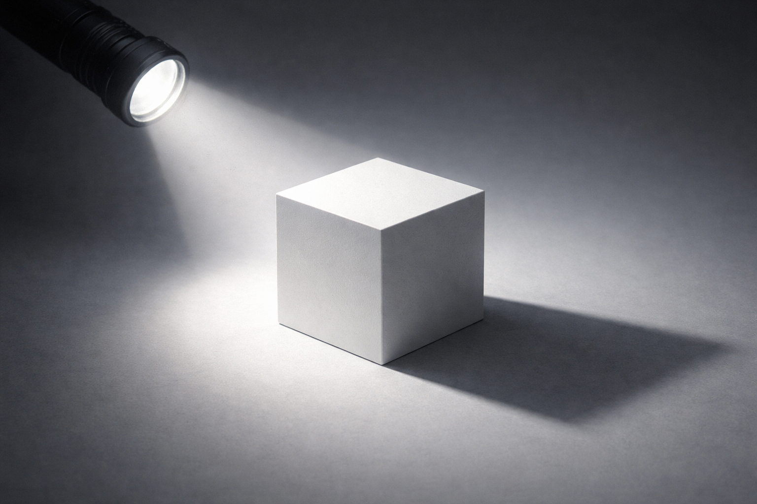 - Ein dreidimensionaler Würfel, mit einer Taschenlampe angestrahlt, wirft einen zweidimensionalen Schatten auf den Boden.