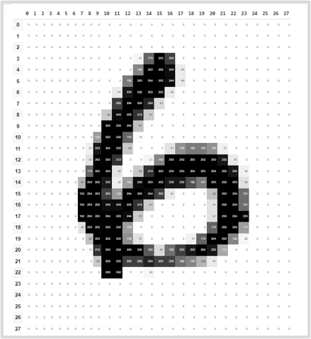 Der MNIST-Datensatz enthält handgeschriebene Ziffern als monochromes Bild mit einer Größe von 28 × 28 Pixel. Jedes Pixel hat einen Grauwert zwischen 0 (schwarz) und 255 (weiß).